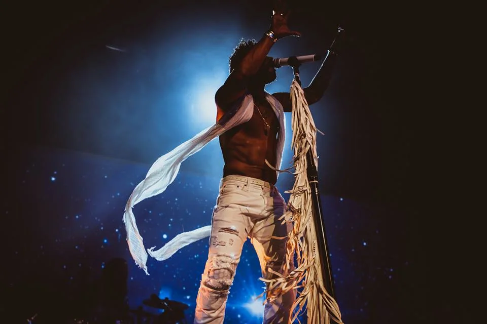Preceded by his opening act, Dorothy, Miguel took the stage donning an all-white ensemble including a feathered leather jacket and mustard-colored boots. His microphone stand was covered in white fringed material of some sort, and the stage consisted of nothing aside from his band and a backdrop that displayed digital graphics throughout the two-hour show. Though he had a number of wardrobe changes, he stuck to the theme of all white.